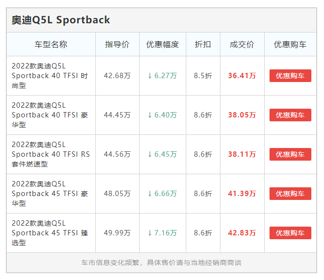 Sportback近一个月的成交价最大折扣达到了8.53折,新车现金最高直降7.16万元,新车全国售卖36.41万元起。点价格仅供参考,实际成交价以当地经销商为准。
