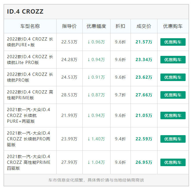 本站调研收集了大众ID.4 CROZZ的近一年的真实成交价,ID.4