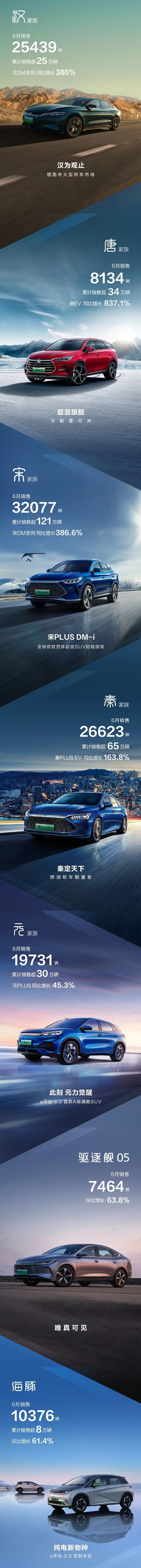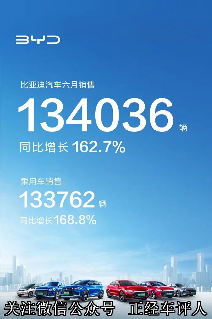 根据其公布的6月份销售数据,比亚迪在上个月一共卖出了134036辆,同比增长162.7%,管比增长16.6%,看这个增长速度的话,完成年初比亚迪年销150万辆的目标,还是很有希望的