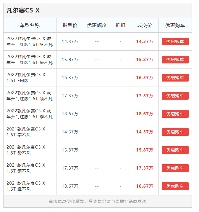 X近一个月全国最低成交价为14.37万,新车最高现金优惠0.00万元,新车最大折扣达到10.00折!价格仅供参考,实际成交价以当地经销商为准。