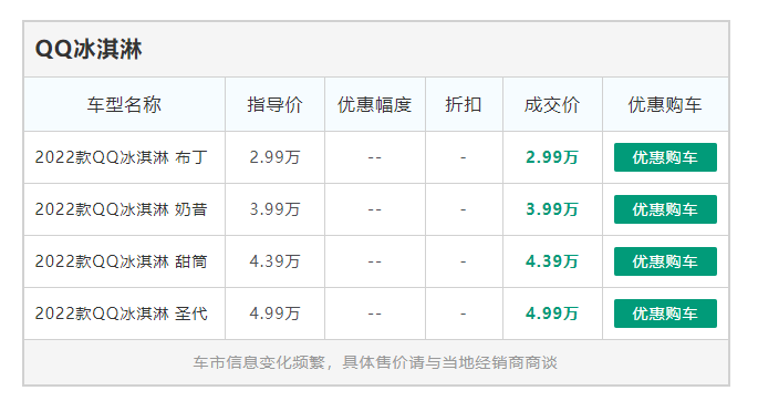 本站采集了奇瑞新能源QQ冰淇淋的真实成交价,QQ冰淇淋近一个月全国新车现金最高直降0.00万,最大折扣达到10.00折,本站全国实时采集价格,实际成交价请以当地经销商折扣为准。