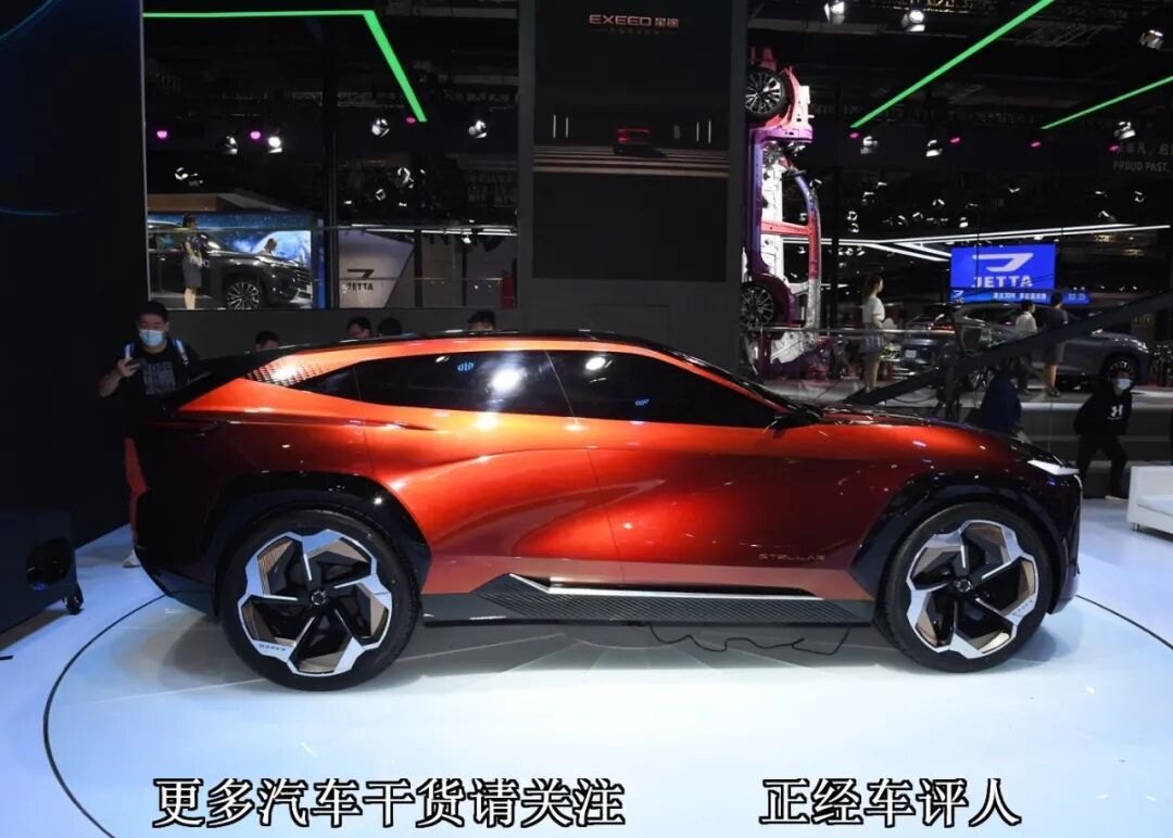 这台车是一台纯电平台制造的车,前脸采用了封闭式的前进气格栅,两侧的大灯组采用了L型的布局,贯穿式的灯带把整车的气势拉到了最强,雾灯区域也设计了矩阵式,排列的三角形灯组和灯带设计,整个车身侧面的线条饱满立体,该车身的侧边加装了一条金色的线条,富有很强的动感性,后尾部使用了,跨界遛背的轿跑风格设计