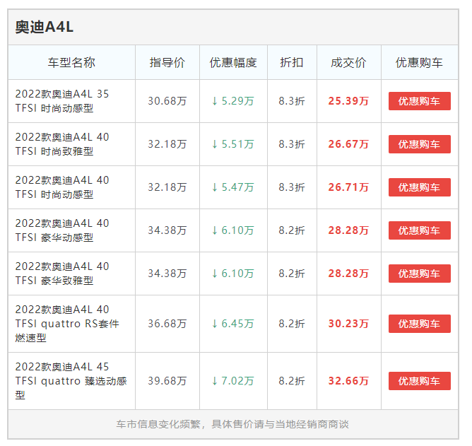 本站采集了奥迪A4L的真实成交价,奥迪A4L近一个月全国新车现金最高直降7.02万,最大折扣达到8.23折,本站全国实时采集价格,实际成交价请以当地经销商折扣为准。