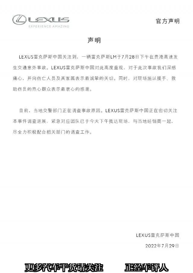 而发生这件事情7月29号的时候,雷克萨斯中国就给了一个声明,就首先他们表示很遗憾,其次呢他们在这个声明中说,他们已经派了人员到现场,配合交警部门做一个调查和经销商做一个善后