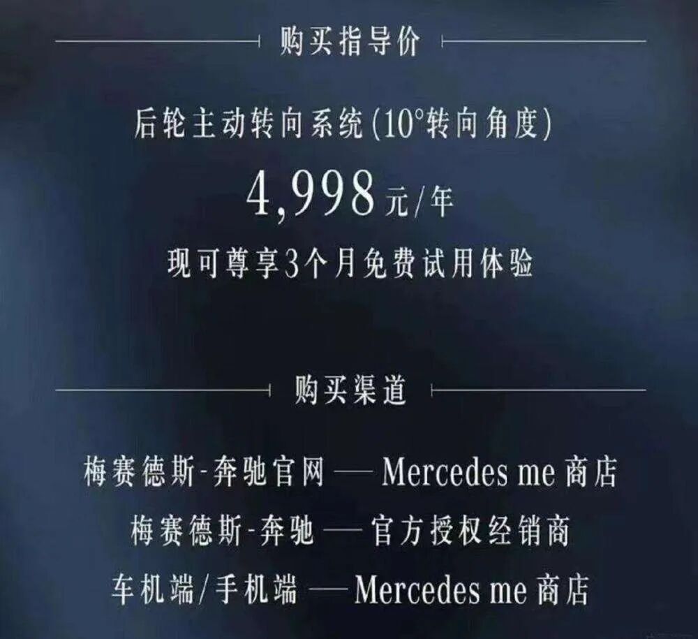 其实,这不是奔驰第一次做类似的事情,更离谱的还有呢,比如针对奔驰的纯电动S级EQS,奔驰推出了一个后轮主动转向的收费服务,后轮转向大家应该都不陌生了,就是打方向的时候后轮也会跟着动,这样一来呢,比如掉头的时候转弯半径就会很小
