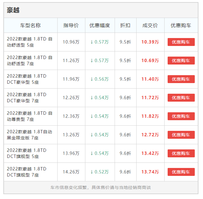 吉利汽车豪越近一个月的成交价最大折扣达到了9.48折,新车现金最高直降0.57万元,新车全国售卖10.39万元起。点价格仅供参考,实际成交价以当地经销商为准。