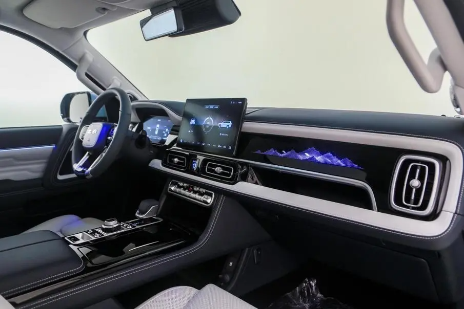 当然BJ60在外观上呢,也有着铁汉柔情的一面,新车主推烟波雾兰的车身配色,蕴含着天空与大海的意境,搭配着前车头看起来就像长城垛口的五孔元素,其实都非常具有中国传统的特色文化底蕴一些细节之处设计的小彩蛋,比如呢尾灯设计灵感呢来源于北京地图这类内敛的文化情怀呢,也是其他合资品牌身上难以言喻的,以上呢还都只是看得见的地方