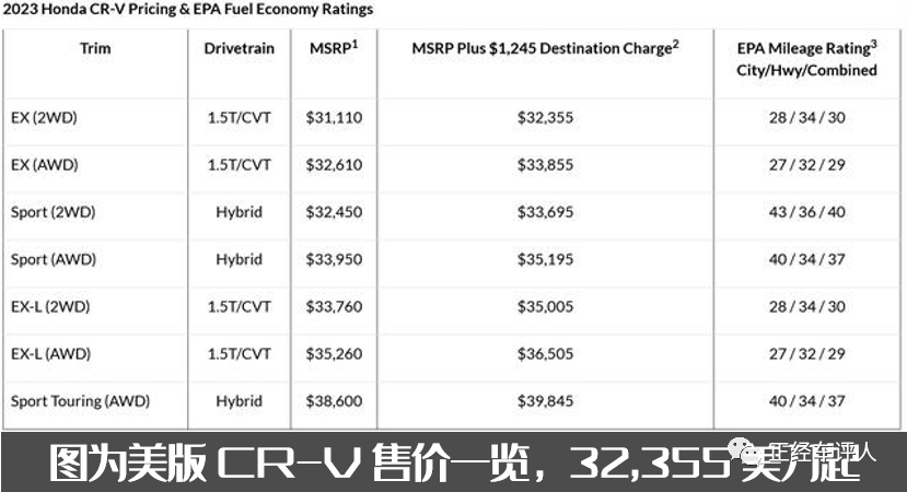 在这里小编需要强调一个细节,就是美版CR-V的混动车型和燃油版的差价并不大,相同车型呢是相差1340美元,就不到一万人民币,这个做法呢,绝对会鼓励更多的用户去选择混动车型