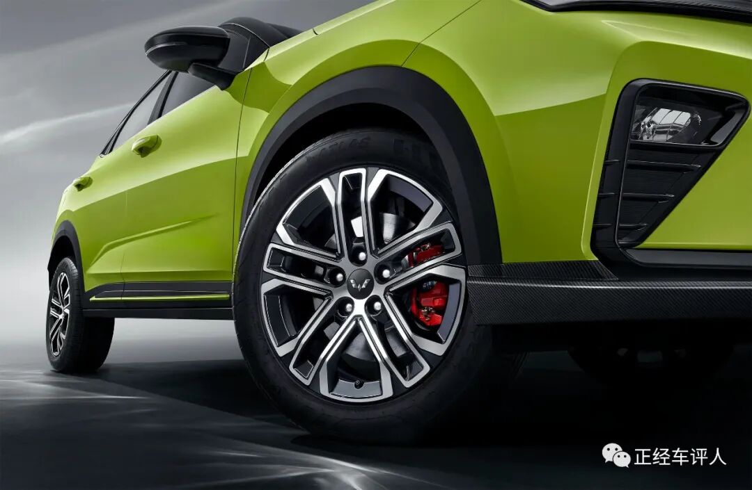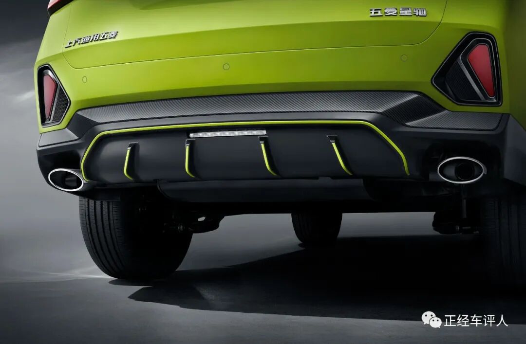 5幅式的轮毂更是设计的点睛之笔,不同配置有16英寸和17英寸,中高配带独立胎压监测,论功能它们都不是什么亮点,尾部造型也很简洁,最高配潮酷版比较有自己的特色,底部带绿色条纹装饰的厚护感,尾部配有真实冒烟的排气孔