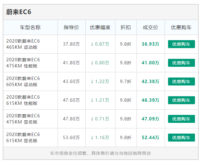 本站采集了蔚来汽车蔚来EC6的真实成交价,蔚来EC6近一个月全国新车现金最高直降1.22万,最大折扣达到9.72折,本站全国实时采集价格,实际成交价请以当地经销商折扣为准。