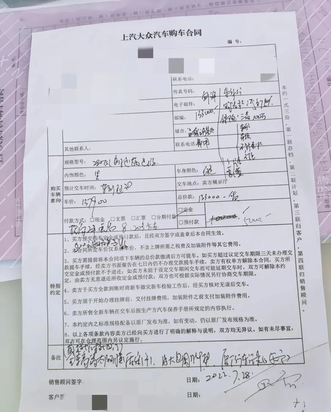 元的加油卡,我就同意了,(特别强调,写合同送的东西一定要写进去,不能信他们的口头承诺)写合同,三责险是100万的,两百万的需要我加二百多。送的东西,就基础首保,记录仪,全包围脚垫,太阳膜,当时销售说提车时私下给我一千元油卡,我也信了,就没在要别的保养,灭火器什么小的赠品了!当时没有现车,我28号订的车到八月十五号去提的,中间车到销售让我去验车,我上班没时间也没去,就让给我拍照发了发动机编号,和车架号,上牌啥的,交保险和打尾款,我都是微信直接转账过去的,他们给办的,我都没有去管,想着现在信息社会,他们也不敢收了钱不给车,提车时他们把牌照都给上好,要油卡时,销售说送的东西都在合同里写的,没有油卡的,我当时一听很气愤,被阴了,事已至此也没啥可说的,也不想扯皮了,就直接开车走了,