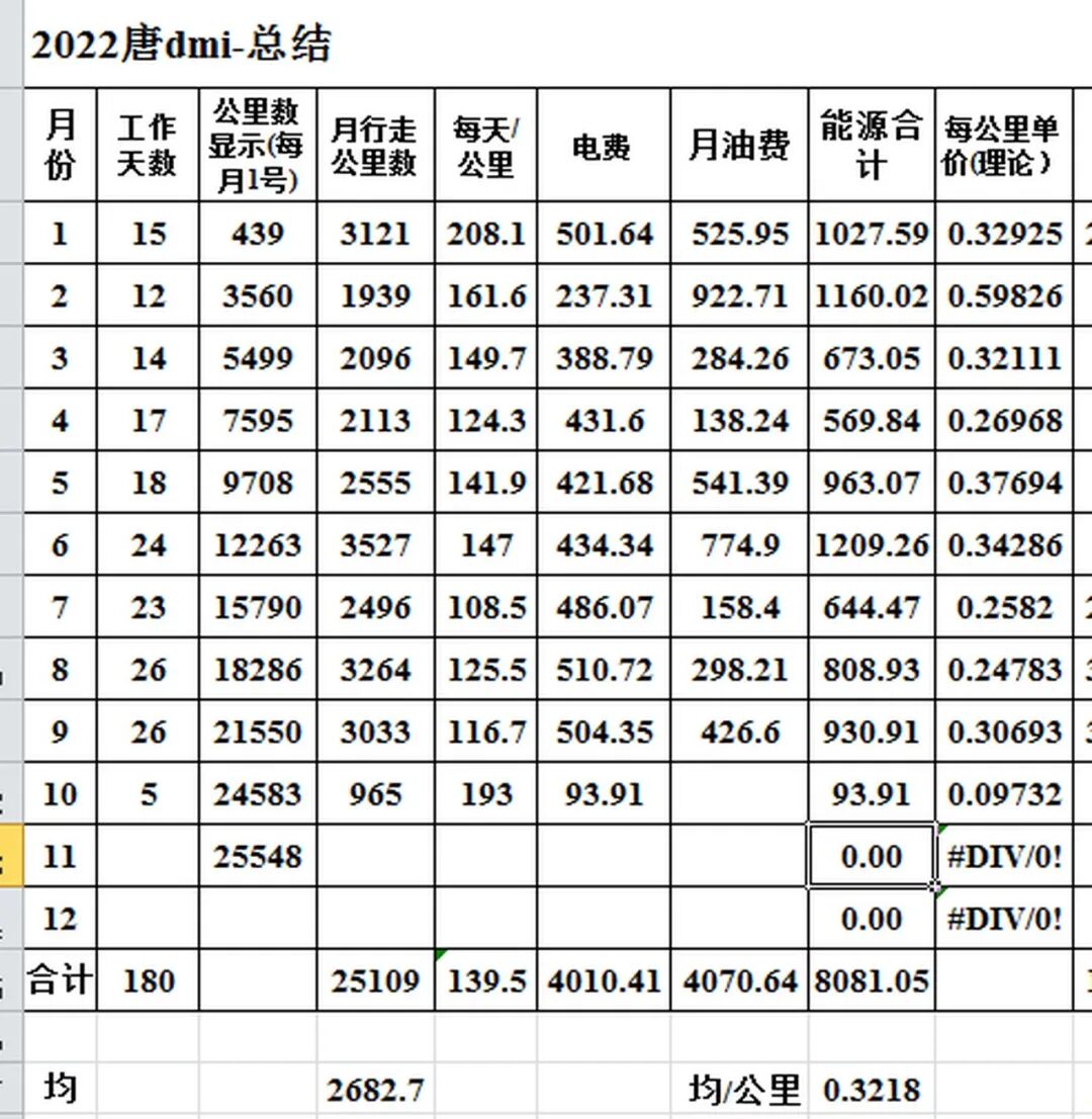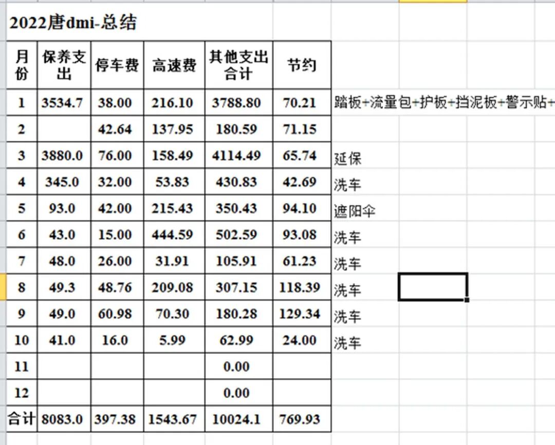 说正题,我从2020年以来,是有一个具体表格来记录用车成本的,以现在2022年主要开唐dmi来说,包括充电、加油、洗车、停车费、延保、车子配件等,关于我车子的每一分钱的花费,我都有记录。