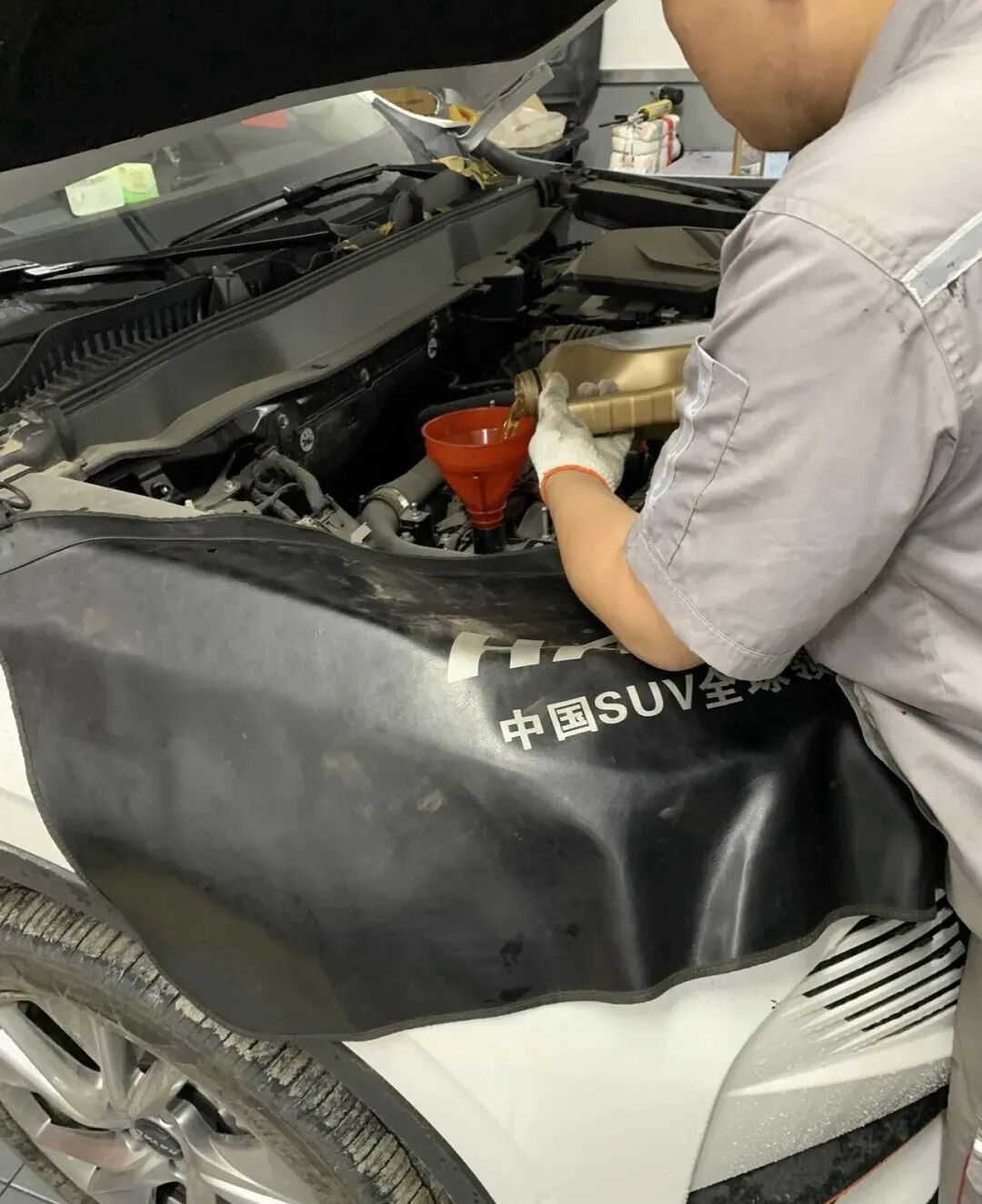 放完机油,安装好了机油滤芯,就把车子放了下来,然后给车前的翼子板套上了保护套,开始加注机油,小哥告诉我,需要加注的机油是4L多一点,也就是一大桶(4L),一小桶(1L)。小哥一边加机油,一边看机油尺的刻度,直到达到要求,才没有加注了,所以小桶的机油,并没有全部加注进去,我也特意看了下,使用的也是全合成机油,剩余的小桶的机油并我没带走,想想自己带走,好像也没什么用。