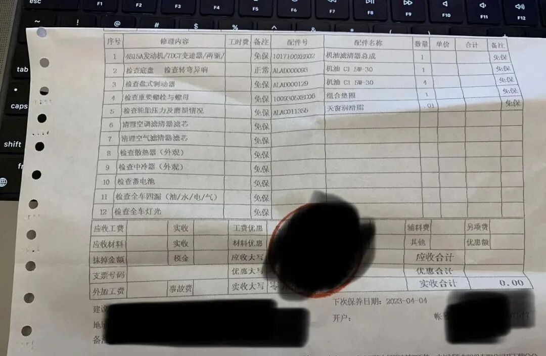 到这里,保养就完事了,售后小哥给了我个信封,里面是本次保养的内容,费用,当然了首保是免费的。以及下次保养的时间。这点还得表扬一下,很贴心。车车洗白后,就准备回家了。