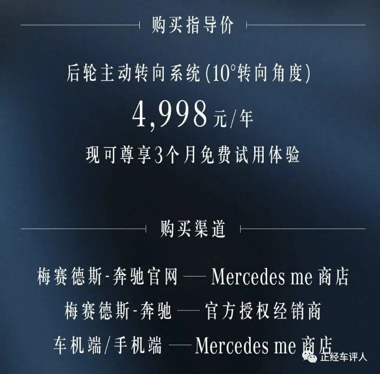 前段时间的付费订阅,可以说是汽车圈的一大热门,事件的起因是奔驰针对EQS的入门版车型450+先锋版,推出的一项年费订阅制服务,一年交4998元,就可以通过OTA远程升级,解锁后轮转向功能,后轮主动转向角度从4.5度升级到10度,另外车主可以先免费试用体验3个月,再做决定,而EQS的其他版本车型则标配了此项功能