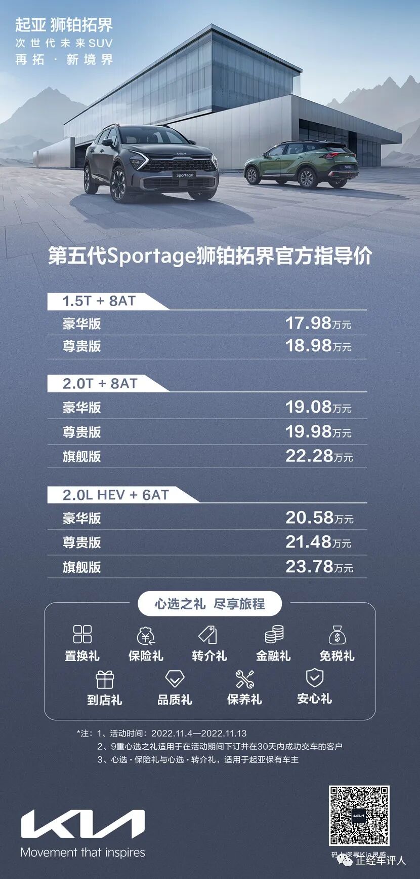 2022年11月3日,起亚旗舰SUV第五代Sportage狮铂拓界正式上市。新车官方指导价为17.98万元-23.78万元,共推出8款车型,并为消费者带来了置换礼、保险礼、转介礼、金融礼、免税礼、到店礼、品质礼、保养礼、安心礼九重购车心选之礼。同时,面向中国市场的第五代Sportage狮铂拓界更在设计、动力、空间、智能及安全配置等各方面全面增配,旨在为国内MZ世代群体带来全面进阶的高品质用车体验,以全能战士的满级战力,陪伴MZ世代再拓人生新境界。