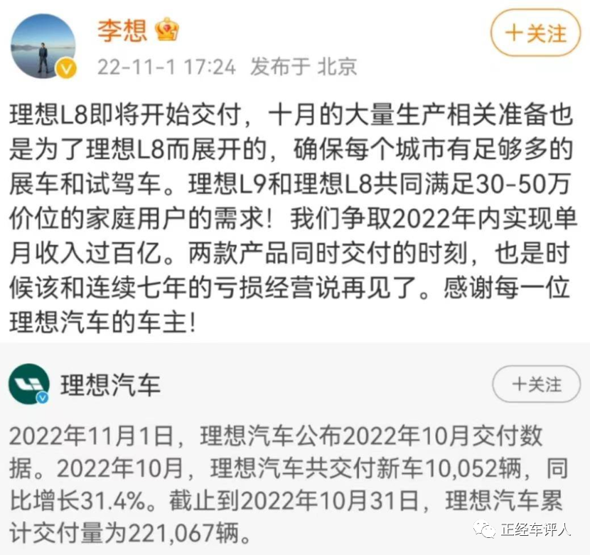 随后,该条微博内容被理想汽车CEO李想转发,并在评论中提到,“理想L8即将开始交付,到时候理想L9和理想L8将共同满足30万-50万用户需求。”同时,他也说到“理想争取2022年内实现单月收入过百亿”和“是时候该和连续七年的亏损经营说再见了。”