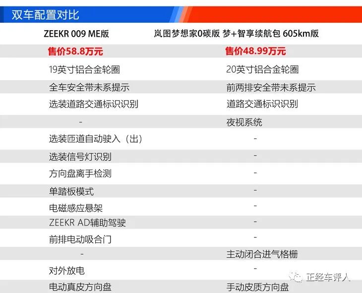 009的6座座椅布局更为实用,并且动力输出也能满足生活场景所需。外观上,两款车也是完全不同的定位,从机甲风到沉稳的家用风格,两款车各有特色。再说配置部分,两款车也是各有各的优势。但最终结合配置、续航、实际用车体验以及售价来说,编者更倾向于推荐岚图梦想家。
