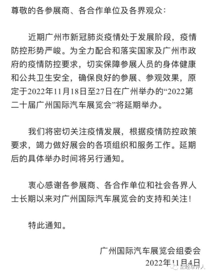 日前,根据广州国际汽车展览会组委会最新公布的消息来看,因疫情原因,原定于2022年11月18日至27日在广州举办的“2022第二十届广州国际汽车展览会”将延期举办,而具体举办时间将另行通知。