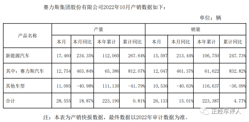 赛力斯10月产销快报显示,10月赛力斯新能源汽车销量达15597辆,同比增长213.44%;其中,赛力斯汽车10月销量为12047辆,同比增长461.37%。而根据乘联会最新公布的数据,10月问界M5销量是6812辆,问界M7销量是5226辆,问界系列合计12038辆。