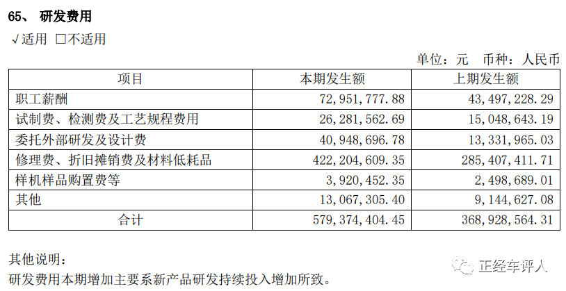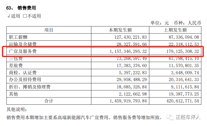 再来看看赛力斯2022年半年报中透露的数据,在上半年高达14.6亿元的营销费用支出中,广宣及服务费达到了11.57亿元,占营销支出总额的79.27%,而在去年同期的这笔费用才1.79亿元,同比增速达546.11%。与之形成鲜明对比的是,上半年的研发支出仅有5.8亿元。