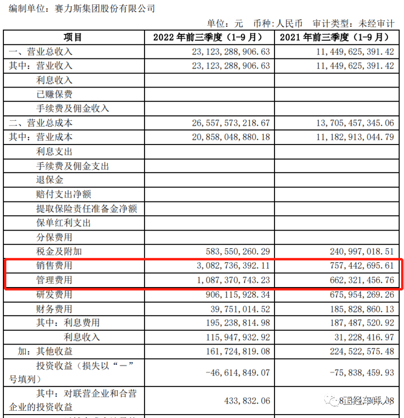 赛力斯三季报数据显示:2022年前三季度,赛力斯集团的销售费用一项支出就达到了30.83亿元,相比上年同期的7.57亿元,净增加了10.39亿元,同比增长307.27%。
