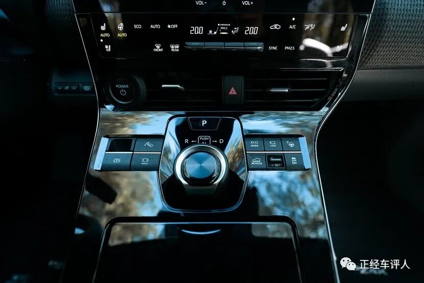 档位区域有些复杂,切换用了旋钮式,不动N档,往左R档,往右D档,P档单按,一开始可能让人有点难适应。但周围分布有电子手刹、自动驻车、全景影像、驾驶模式切换等功能按键,相比很多新势力要深入中控的四级五级菜单才能调整,个人认为,bZ4X的物理按键驾控区不仅方便,也更适应于这个从传统向未来转型的汽车新时代。