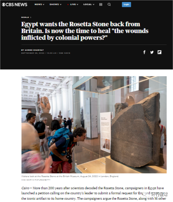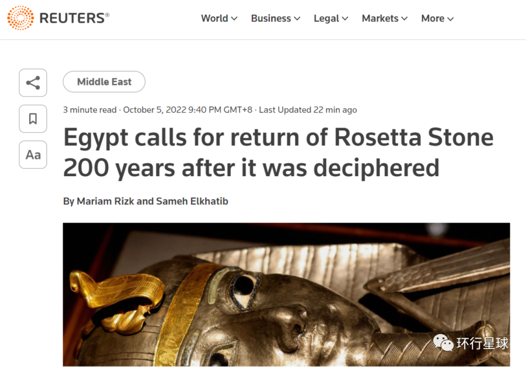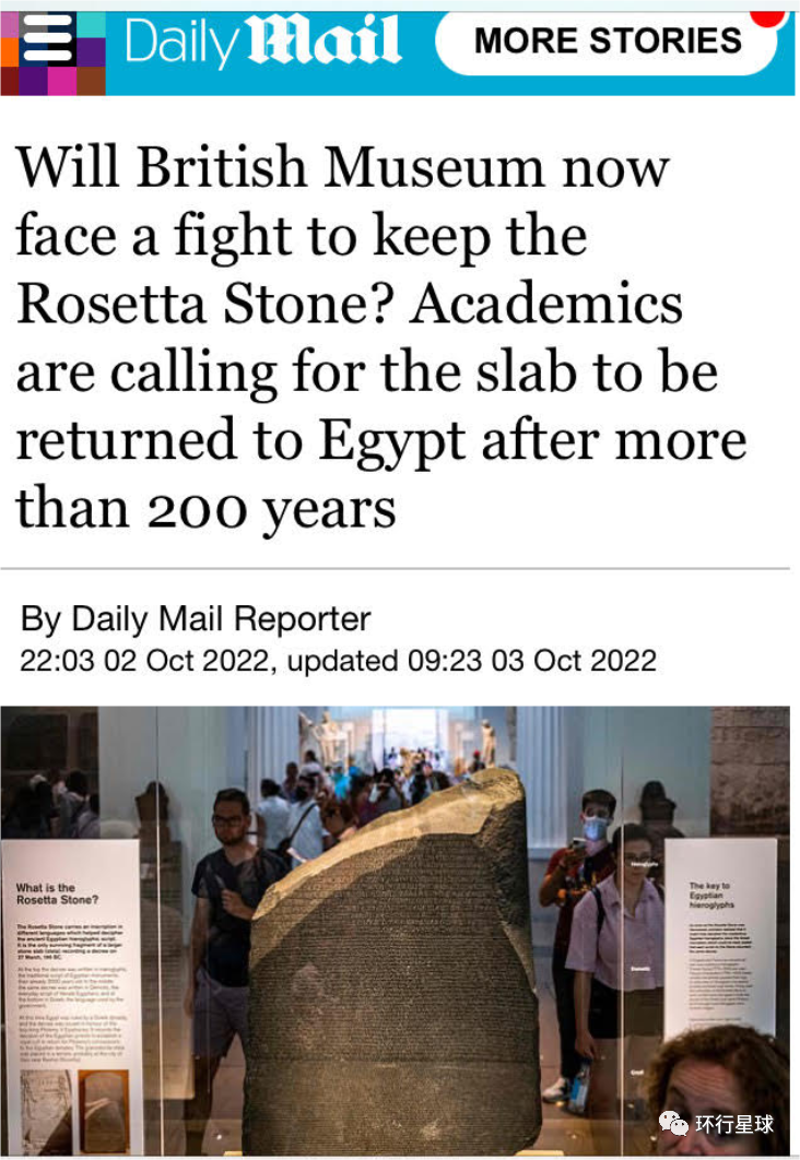 欧美主要媒体最近都有专题新闻报道,介绍埃及活动家们正在向埃及政府请愿,以便正式要求英国归还罗塞塔石碑及其它16件标志性埃及文物。专家们呼吁:这些珍贵艺术品是几个世纪以来英国从埃及非法夺走的,如今该物归原主了。