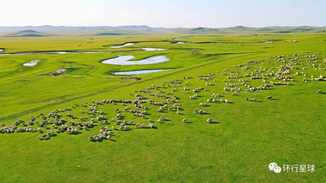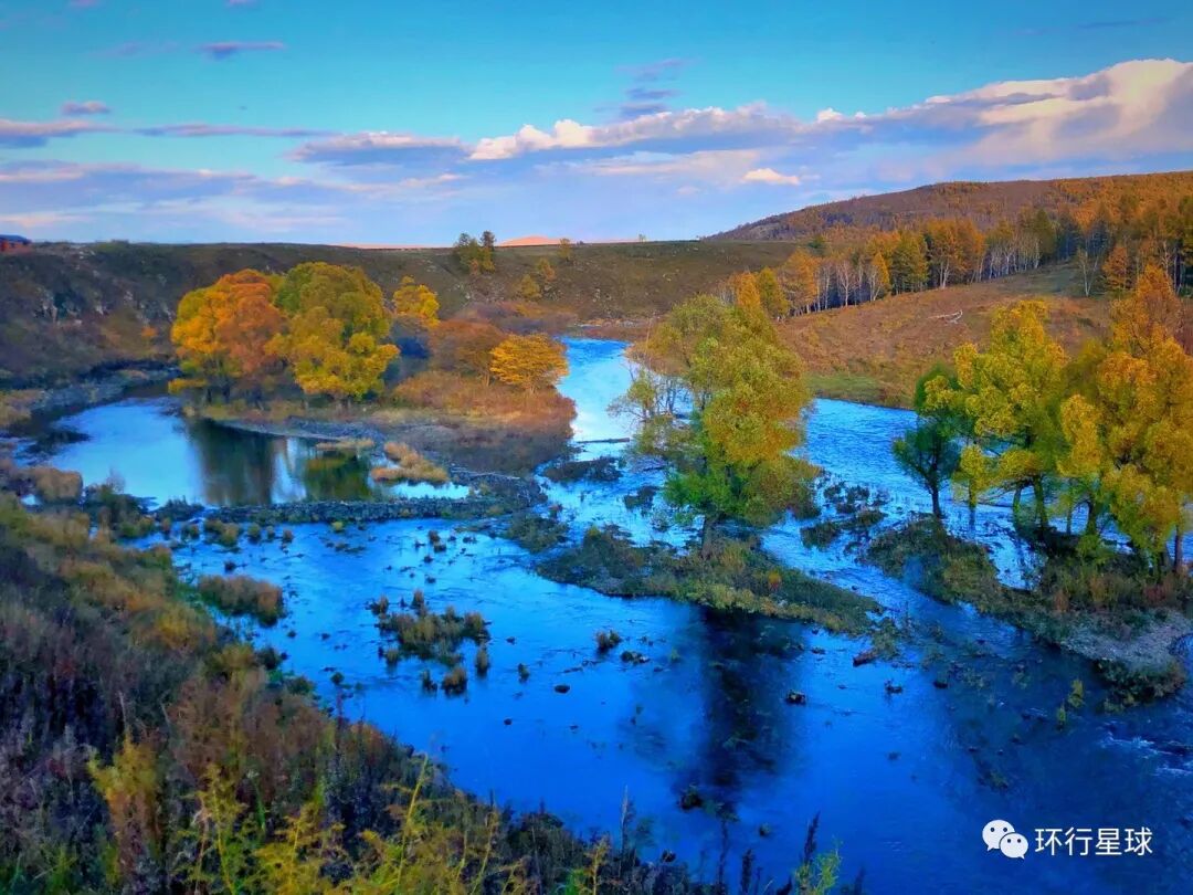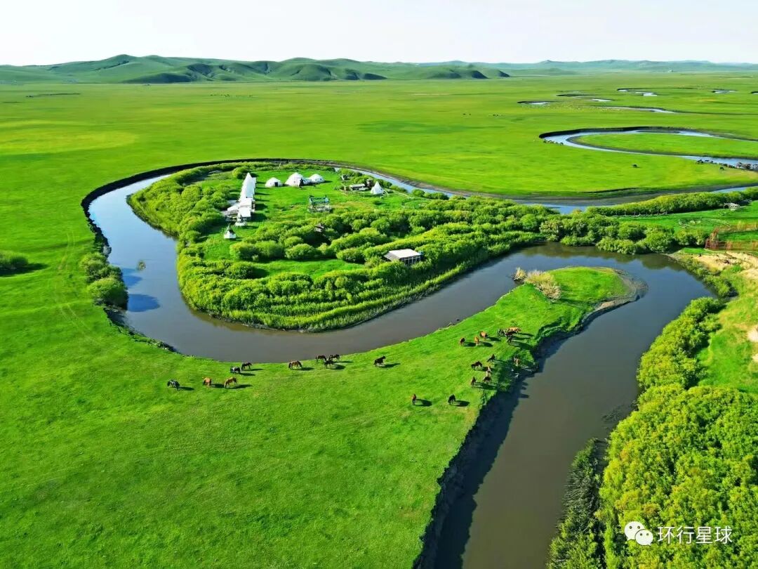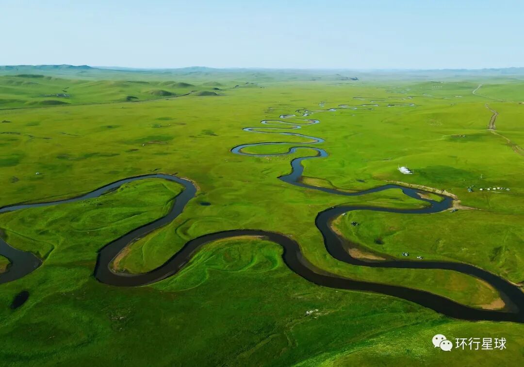 河道迂回弯曲,水路辗转往复,可谓九转回肠,如果使用无人机鸟瞰,河水蜿蜿蜒蜒,就像是一条蔚蓝色绸带。春夏之时,河边两岸芳草遍地,鸟语花香,蝶飞蜂舞,弯弯曲曲的河水,成群的牛羊,点点的蒙古包。构成了一幅完美风情画,满足你对草原的一切幻想。