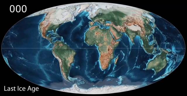 那这场洪水到底为什么会发生呢?答案是冰川融化。在地球演变的过程中,曾经出现了几次冰川时期,其中最近的一次是第四季冰期。在第四纪冰期时期,全球平均气温下降10℃~15℃,全球有1/3以上的大陆被冰雪覆盖,导致海平面下降130米。在距今240万年以后,地球经历了至少24个气候旋回,冰期和间冰期的交替出现。在冰川顶峰时候,分布在亚欧大陆的直立人和早期智人都因为不适应寒冷的环境而灭亡。