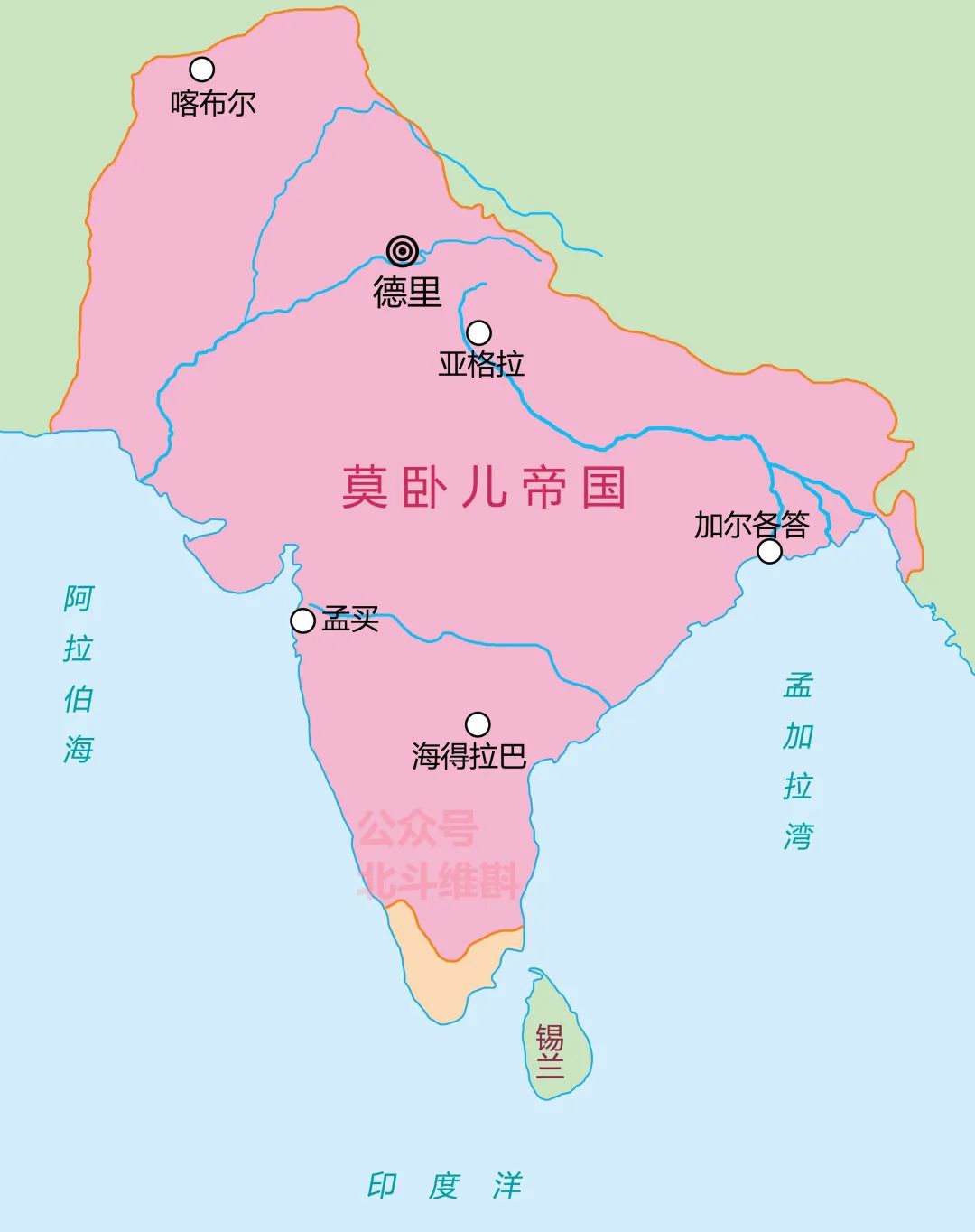 1526年,突厥化的蒙古人巴布尔带领军队侵入了印度,取代德里苏丹国建立了一个新王朝,该王朝的正式国名叫做“印度斯坦帝国”。该帝国长期稳定,在版图上基本统一了南亚大陆,在经济上和清朝一起将传统农耕文明发展到了顶峰,人口达到了1.5亿。
