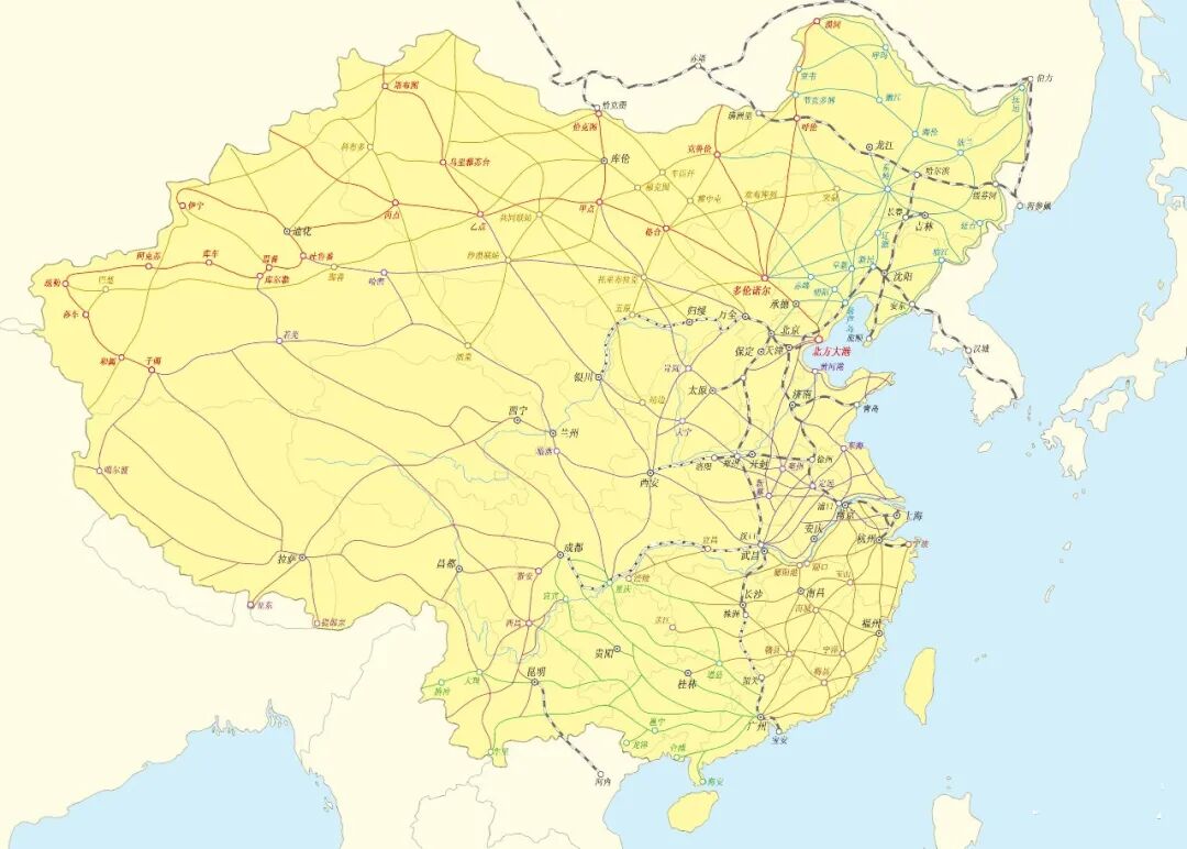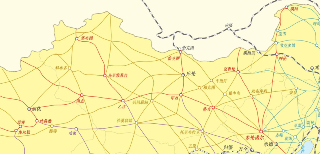第四条、第五条和第六条都是以乌鲁木齐为中心修建的延伸线,其中第四条修建到伊犁,第五条修建到喀什,还可以经过帕米尔高原到达于阗。第六条是从北方大港到乌鲁木齐的中间选择一处修建一条铁路到达恰克图。第七条是从北方大港到乌鲁木齐的中间选择一处修建一条铁路到乌里雅苏台,最终达到边境。第八条是到达科布多一带的。当然,中间还有许多小的支线。