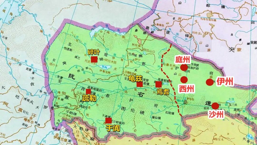 塔里木盆地,中间为塔克拉玛干沙漠,四周环绕着小城邦,这种局势导致此地的城邦难以形成强大、统一的政权,一般都被外来势力奴役。汉朝时期,其中库车(龟兹)是一个重要的地方。汉朝在库车一带设置了西域都护府,在此屯田。汉朝退出西域后,柔然、高车、嚈哒、突厥先后控制诸国。唐朝时期,该地区成为了吐蕃和唐朝的争夺的地区,唐朝以龟兹为中心,设置了安西四镇。