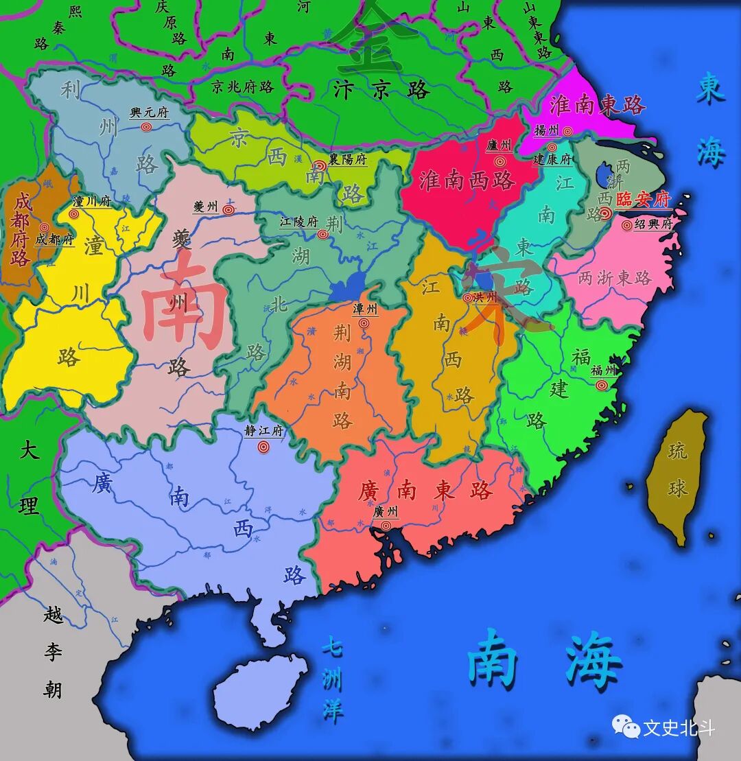 宋朝时期,实行了路府州制,其中位于西南的路有:利州路(汉中、川北)、梓州路(川南、川东)、益州路(成都平原)、夔州路(重庆、贵州),而这四个路都是由西川路和峡西路拆分出来的,所以总称为“川峡四路”,这就是四川名字的来源。位于长江中游的路有荆湖北路和荆湖南路,以洞庭湖为界,是今天湖北和湖南的地名起源。位于东南地区的有两浙东路(浙南)和两浙西路(浙北,苏南),淮南东路(苏中)和淮南西路(皖南、皖中)。其中两浙路称为今天浙江的名字起源,浙江就是古代对钱塘江的称呼。位于岭南的路有福建路、广南东路和广南西路,是福建、广东、广东的名字来源。其中福建取名了福州和建州的首字。从唐朝到宋朝,今天的云南地区存在着南诏国和大理国等政权。在名义上接受了中央的册封,为“云南”王等。云南起源于汉朝设置的云南县,意思为“云山之南”。