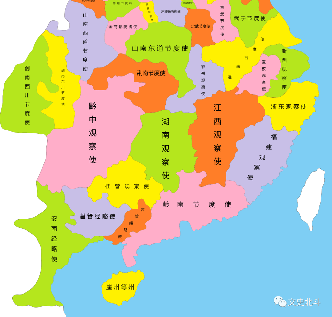 唐朝时期,实行了道州制。其中位于南方地区的道有剑南道(蜀)、剑南指的是剑阁之南。山南东道(湖北)、山南西道(重庆)、这里的山指的终南山,唐朝将秦岭叫做终南山。黔中道,原来的黔中指的沅江流域或者武陵山区,楚国最早设置黔中郡,汉朝改为武陵郡。唐朝设置黔中道,并扩大其范围,将贵州大部分地区都纳入了黔中道,因此“黔”成为了贵州简称。江南东道,也就是江浙安徽一带,简称为江东。江南西道,扬子江以西,后来简称“江西”,但当时的管辖范围包括江南和湖南。岭南道,也就是南岭之南,管辖原来的交州地区。唐朝后期大规模设置节度使,其中在四川盆地有东川节度使和西川节度使,是“川”的起源。
