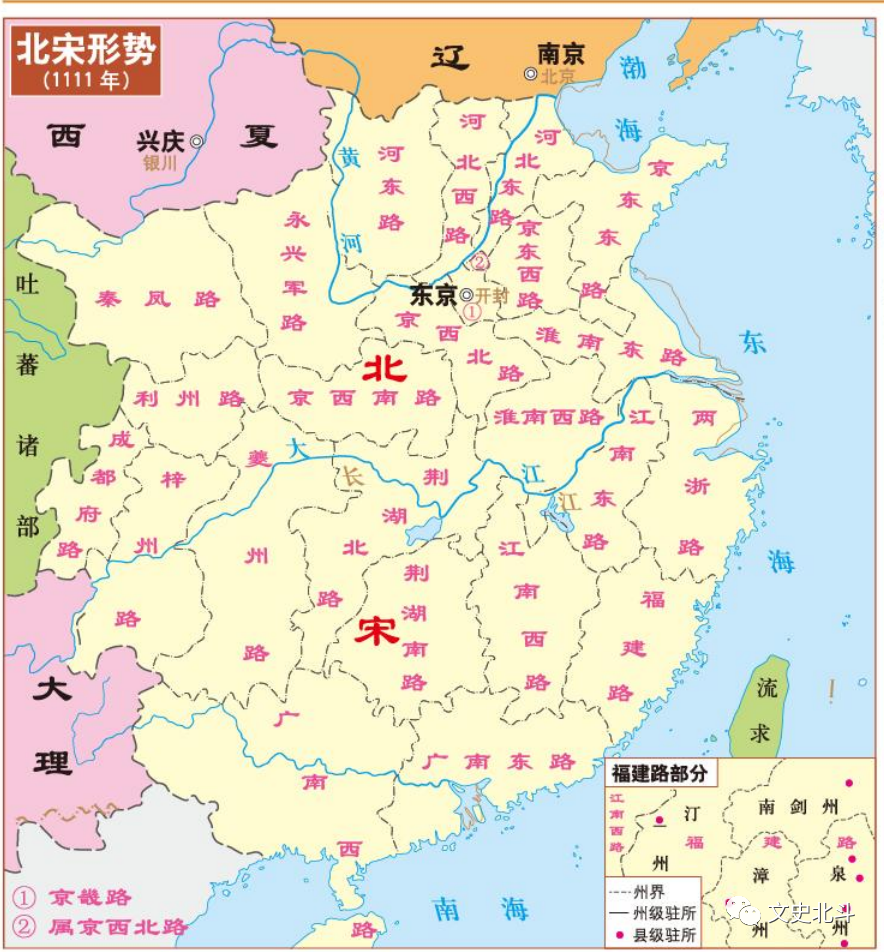 宋朝时期,推行了路制,将全国划分为了20多个路,如今河北地区有河北东路、河北西路;关内道改为了陕西路,陕西的名字来源于“陕右”,周朝时期,周公和召公曾经分陕而治,其中陕就是今天的陕西。陕西就是陕县以西的地区。割据西北的西夏,是宁夏地名的重要起源。夏最早来源于匈奴族在陕北高原建立“大夏国”,唐宋时期称这里为“夏州”。北宋前期,党项族再一次建立“大夏”,史称“西夏”。蒙古灭西夏后,就改为“宁夏”,意思为“西夏安宁”。西夏还将河西走廊的甘州、肃州并称“甘肃”,并设置甘肃军司,是甘肃的地名的来源。