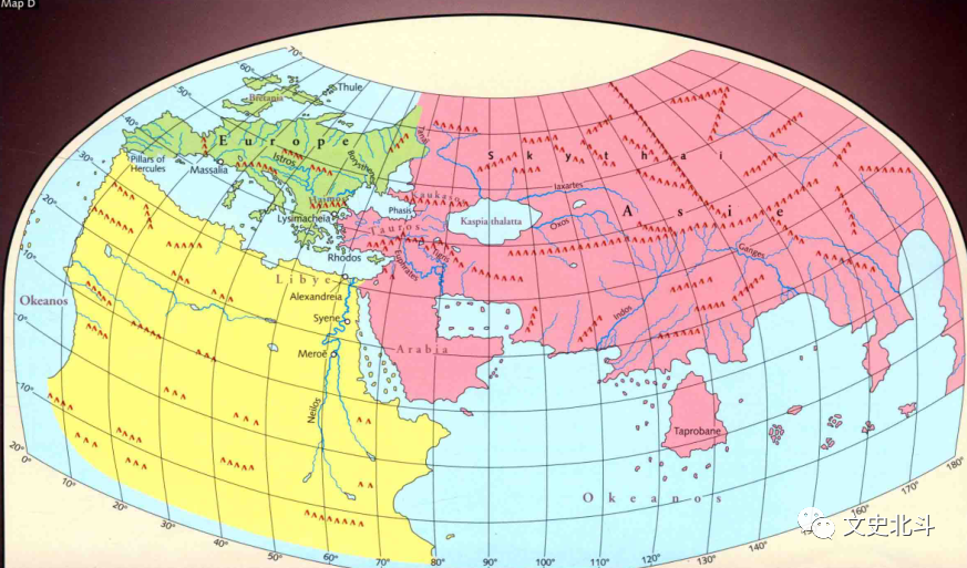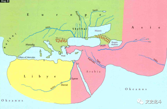 希罗多德绘制的古代地图(上色版):请注意尼罗河的流向