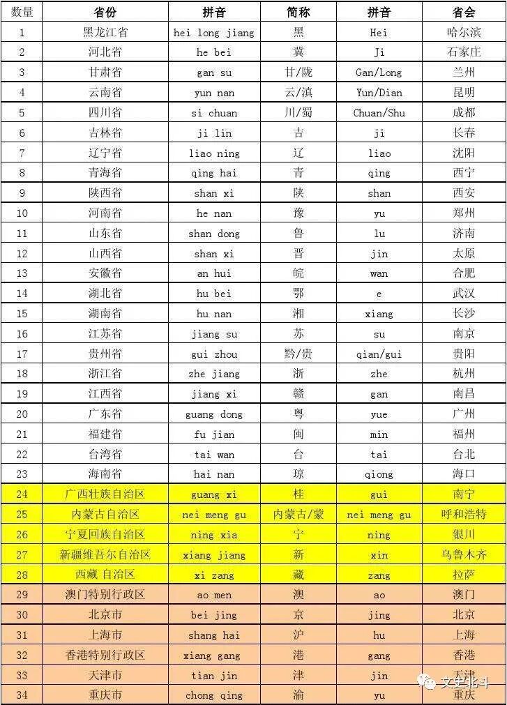 各省简称和省会