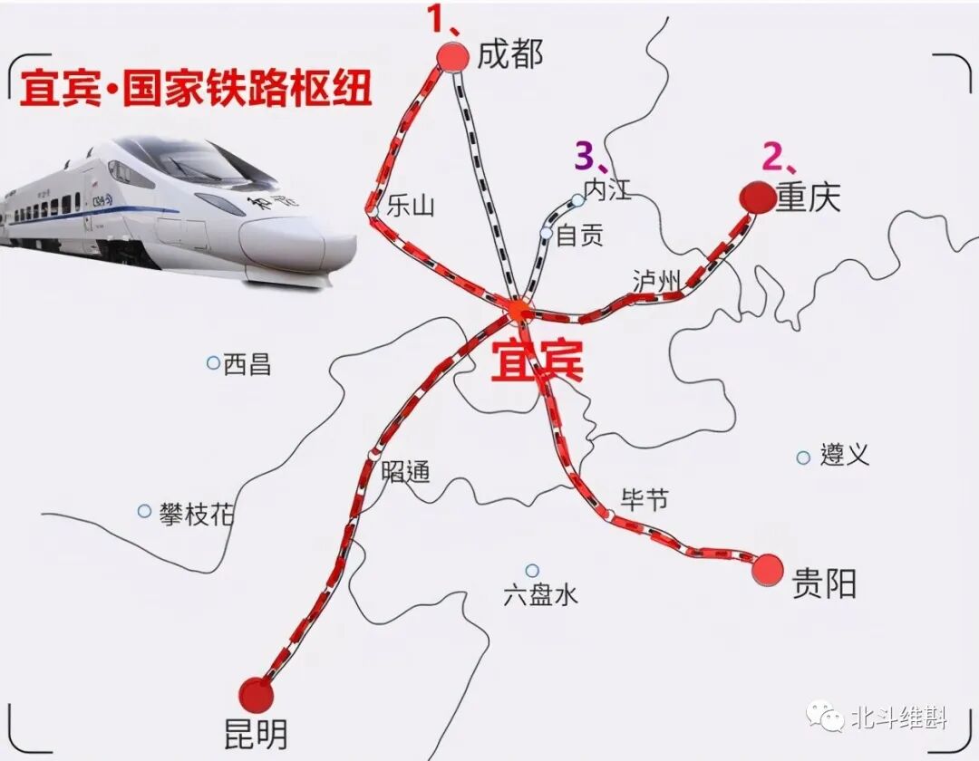 宜宾处于成贵高铁、渝昆高铁的交汇处,是西南地区唯一能够和省会、直辖市并列的大型高铁枢纽城市。拥有了这两大高铁后,宜宾将成为西南地区的经济版图的中心,处于成都、重庆、昆明、贵阳四大城市的中心位置。