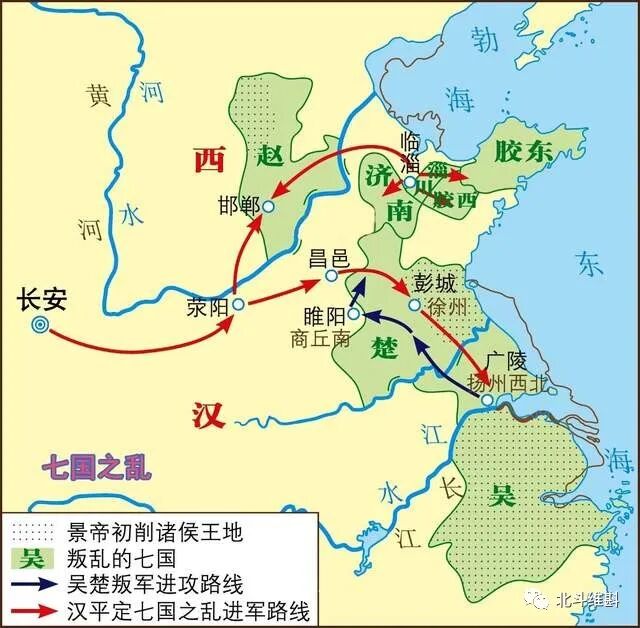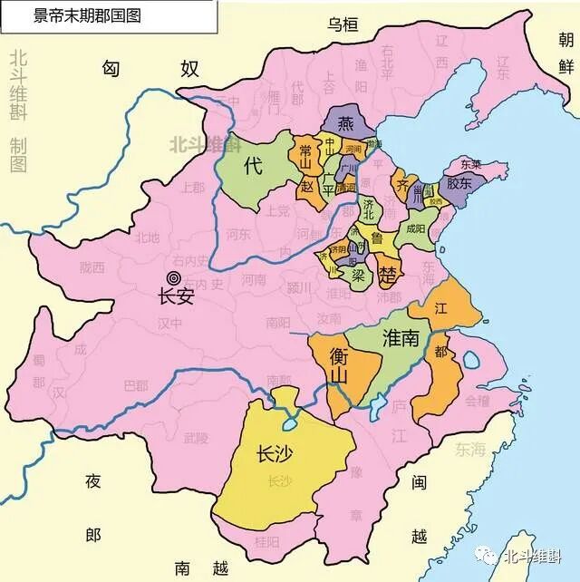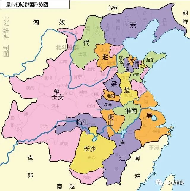 七国之乱后,汉景帝继续推行削藩策,将诸侯的许多郡划给了中央直接管辖,并新增加13人为新诸侯,削弱了旧诸侯。其中叛乱的吴国被废除,其中的广陵和故鄣新分封了江都王,楚国的沛郡、东海也划给了中央。在北方,燕国和代国被大幅度削弱,燕国只剩下了广阳一个郡,而代国则只剩下太原一个郡。