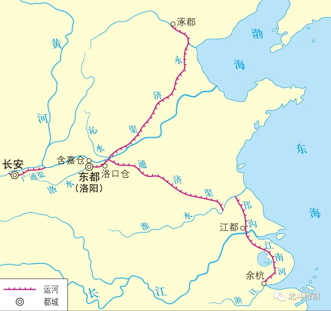 隋朝统一后,杨广在洛阳修建东都。洛阳连接着关中和华北平原,关中控制关东的枢纽城市。隋唐大运河开通后,洛阳又成为南北运河的交汇点。隋朝在洛阳附近修建了许多大型的粮仓,以储存向全国征收的粮食。