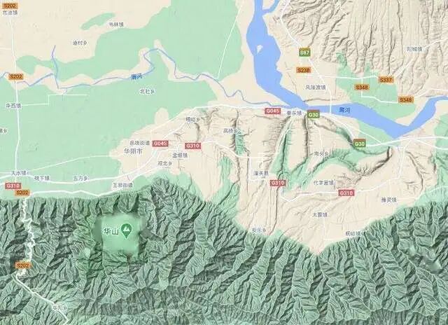 综合以上的地理信息,可以判断萯山就是秦岭东部的华山,这里的河流向北流入黄河,同时也能够看到河曲。