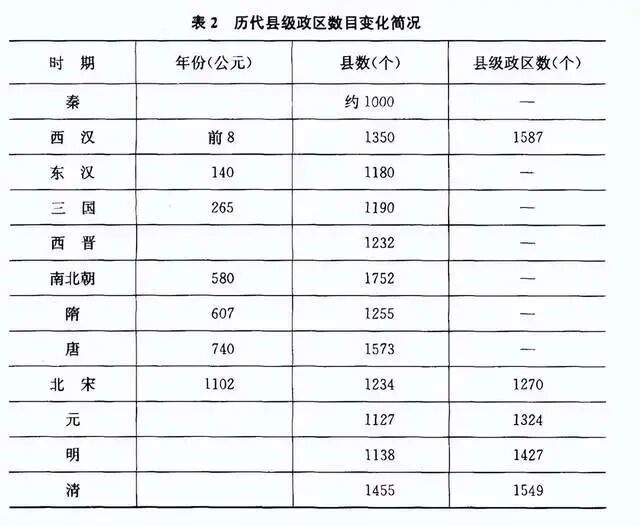 自古以来,中国县的数量都维持在1000多个。秦朝大约有1000个县,西汉最多发展到了1500多个县级行政区划,但是东汉到明朝总体上都是维持在1200个左右。清朝又上升到了1500个左右。县的数量增加和经济发展、人口增长、疆域扩张等因素相关。截至目前,中国有2800多个县级行政区,包括县、自治县、旗等,其中县和自治县有1400多个。