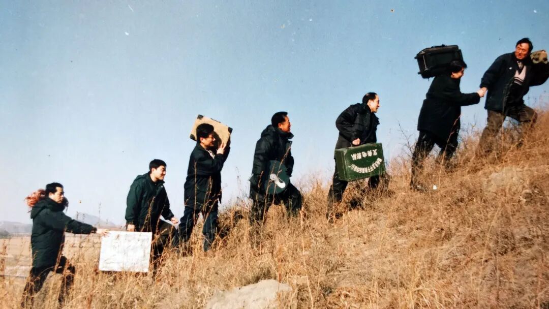 锦州老兵义务电影放映队成员前往放映电影爬山的路上。(资料照片,1999年11月摄)