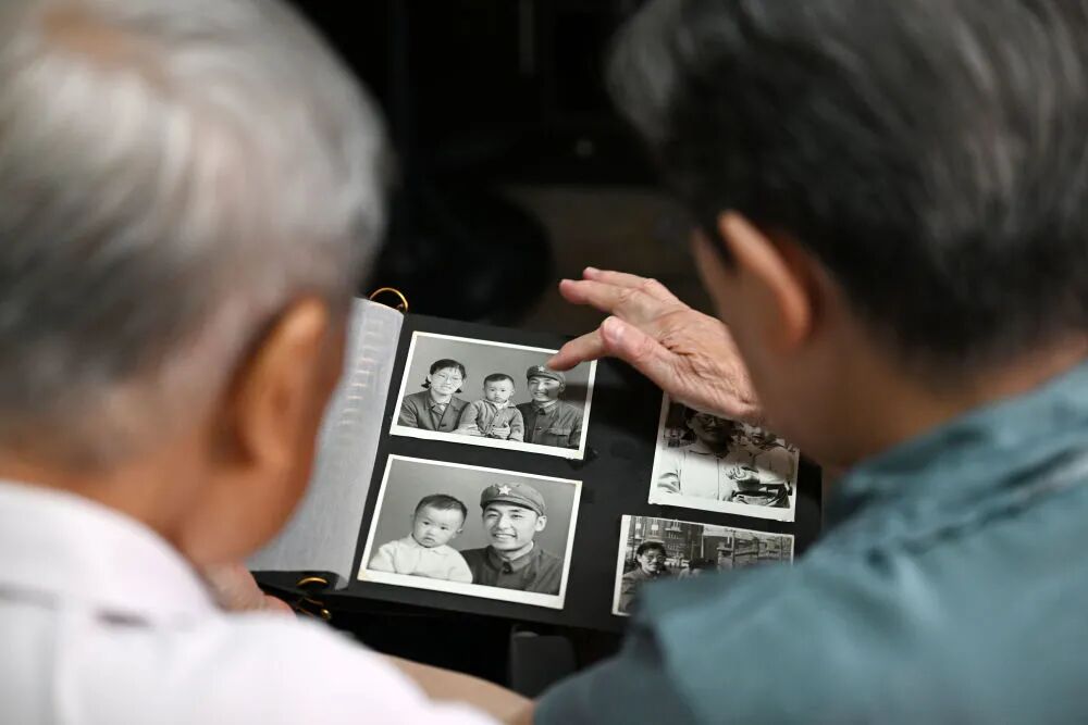 段肇谊和顾伟力在家翻看老照片(8月1日摄)。