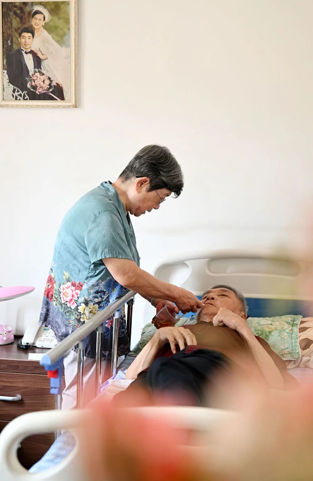 段肇谊(左)给躺在床上的顾伟力喂水(7月22日摄)。