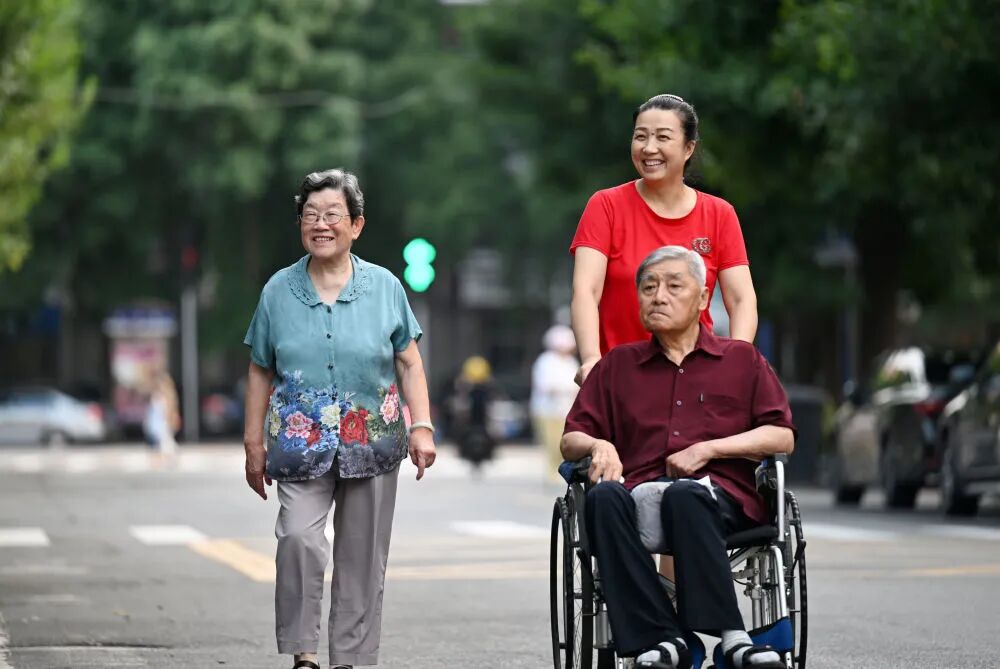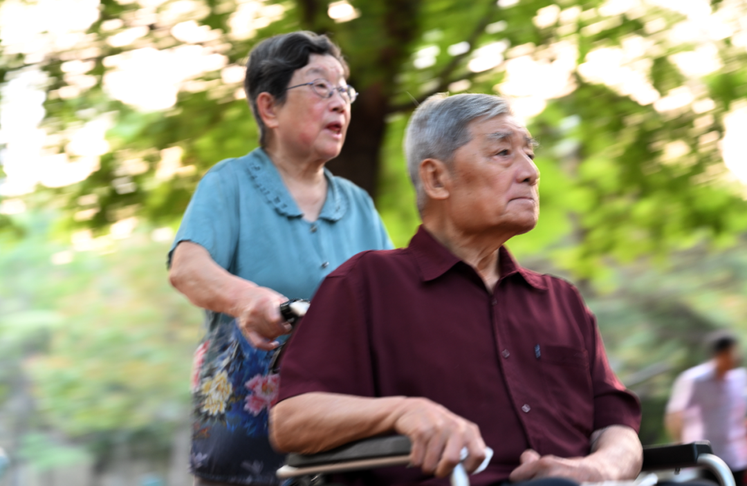 保姆推着坐在轮椅上的顾伟力准备去公园赏花,段肇谊(左)在一旁跟随(7月30日摄)。