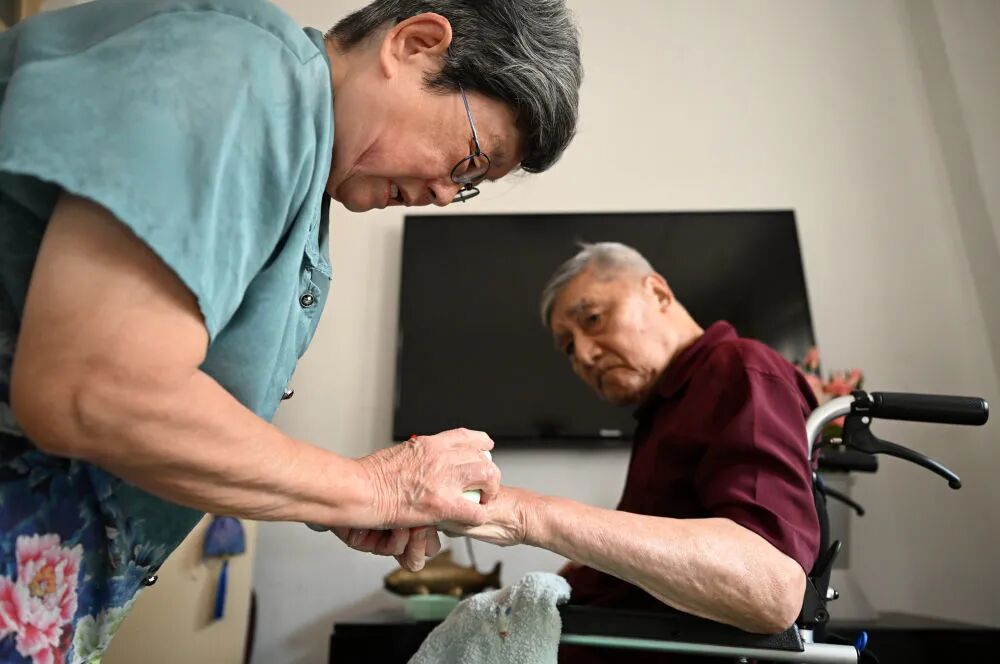 早上起床后,段肇谊(左)帮助顾伟力洗手(7月26日摄)。