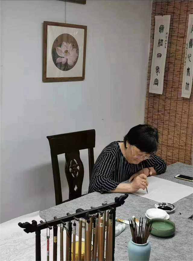 业余时间,她在书房里绘画、刺绣、练书法