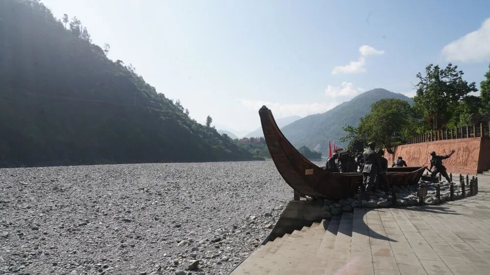 这是2021年4月29日拍摄的雅安市石棉县安顺场镇大渡河畔的渡船模型。新华社记者 刘梦琪 摄